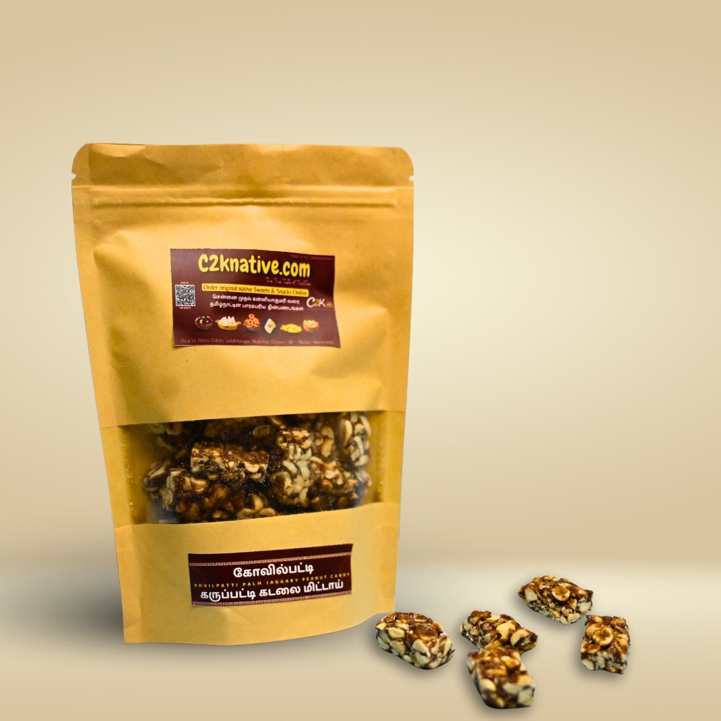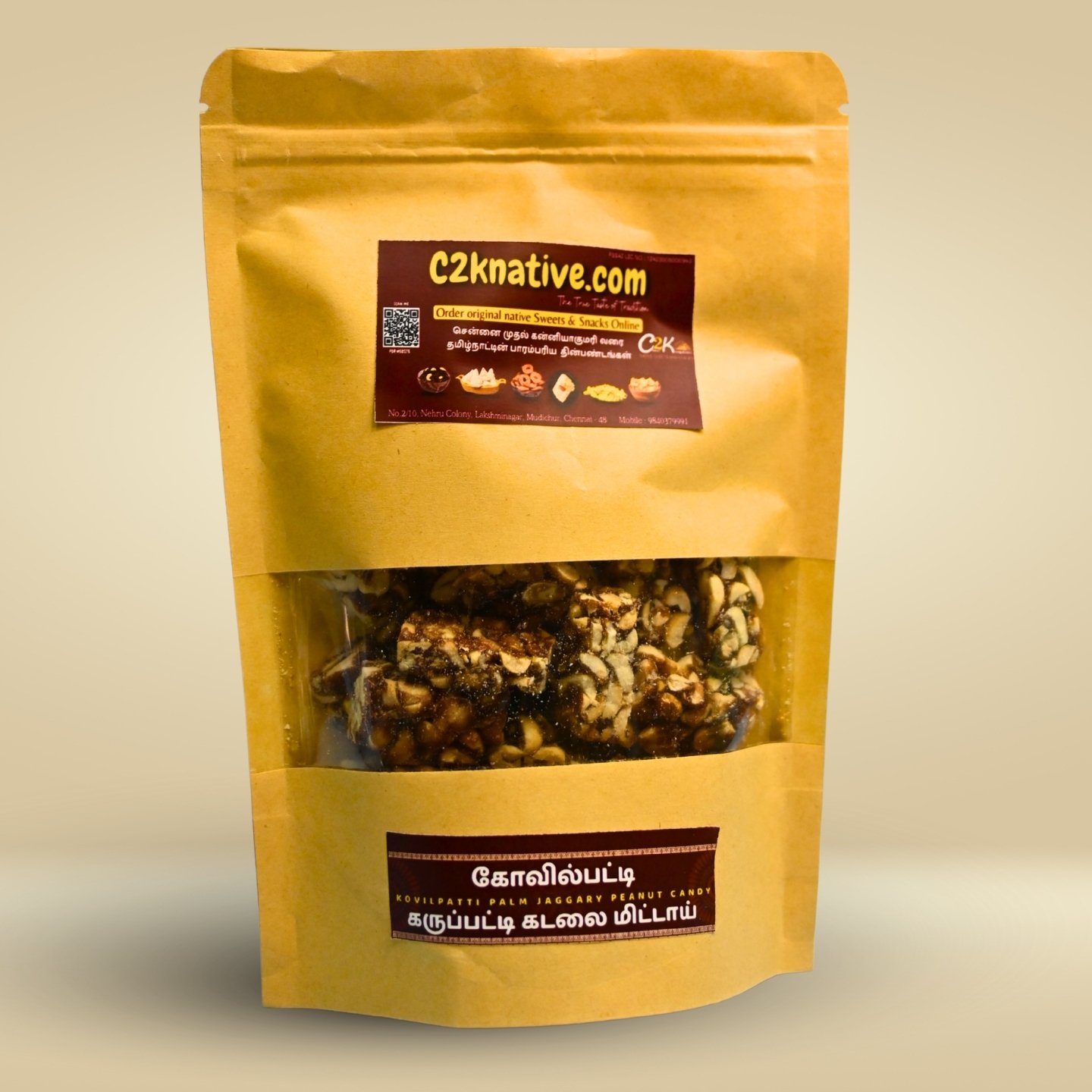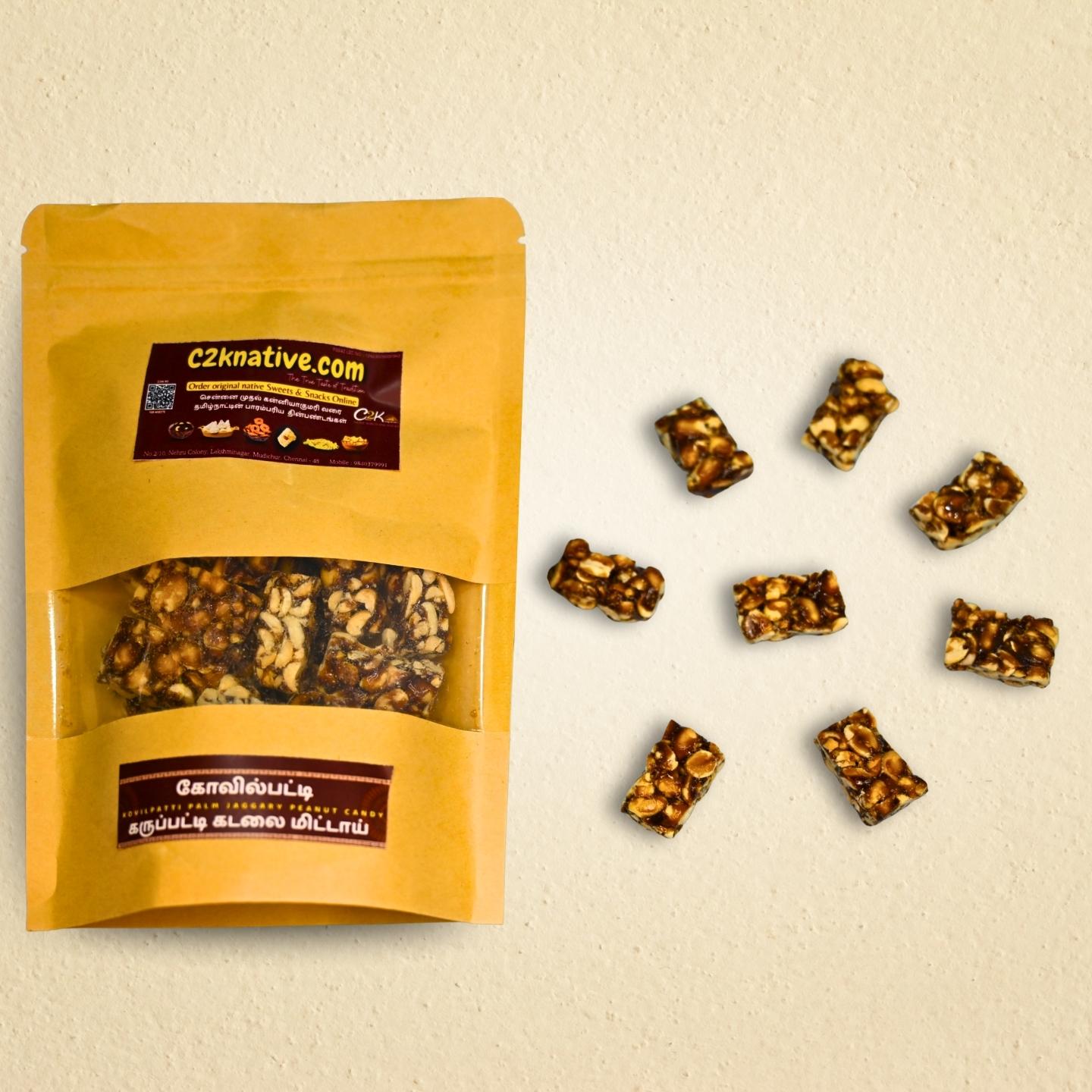 Kovilpatti Karupatti Kadalai Mittai is a traditional South Indian sweet made with crunchy selected peanuts and rich palm jaggery. A perfect blend of sweetness and texture, it’s a delicious, wholesome treat. Enjoy the authentic flavor in every bite!  This crunchy, chewy treat is infused with a rich, caramelized flavor and offers a delightful balance of sweetness and nuttiness. Enjoy the essence of Kovilpatti in every bite!