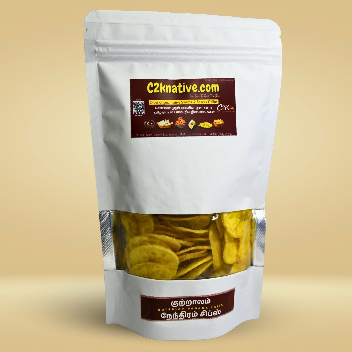 Kutralam Nendhiram Chips are a signature snack from the scenic town of Kutralam in Tamil Nadu, made from the finest Nendhiram bananas. These bananas are thinly sliced, fried to a perfect golden crisp in pure coconut oil, and lightly seasoned to bring out their natural sweetness. The result is a deliciously crunchy snack that’s both savoury and slightly sweet, offering a unique wholesome taste, Kutralam Nendhiram Chips offer a taste of South India’s culinary heritage in every bite.