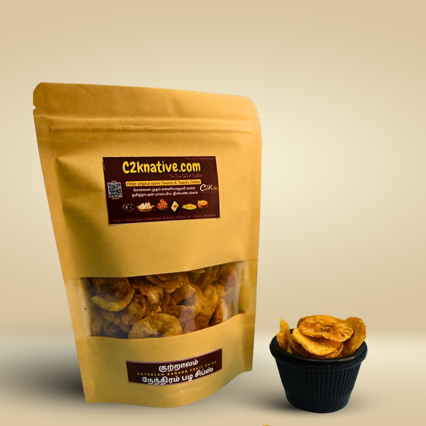 Kutralam Banana Fruit Chips are a crispy and naturally sweet snack from Kutralam, Tamil Nadu, made from thinly sliced raw bananas. Lightly seasoned and fried to golden perfection, these chips retain the natural flavor and subtle sweetness of the bananas.